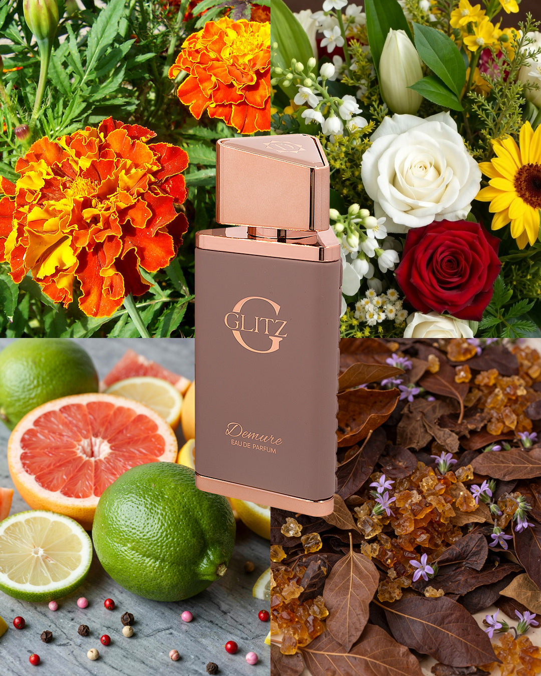 Elegance in its softest form. Opening with bergamot, lemon, and grapefruit, gently spiced with pink pepper, Glitz Demure blooms into a graceful bouquet of rose, magnolia, jasmine, and lily of the valley. It settles into a base of comforting patchouli, warm amber, and sheer musk—a fragrance that speaks softly yet lingers deeply.