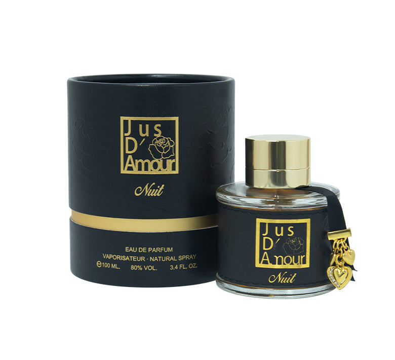 Jus D' Amour Nuit is a fragrance that brings sparkle and finesse to your day. With its combination of apple, jasmine, patchouli, black fox, sandalwood, vanilla, and musk, it mesmerizes and adds a touch of charm to your aura.