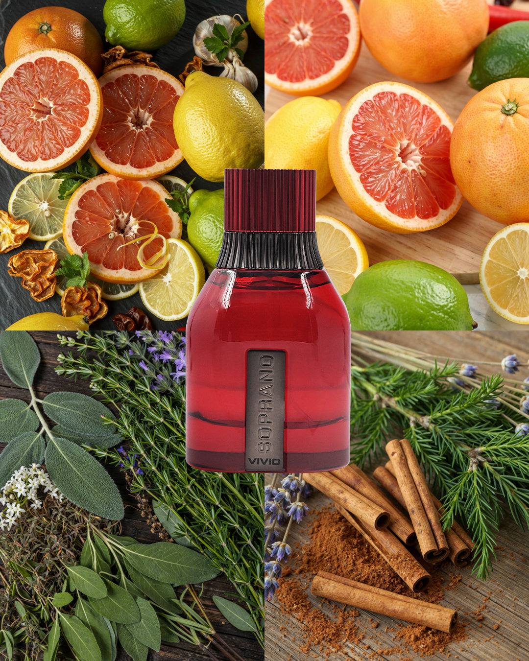 Soprano Vivid strikes a balance between vibrant citrus and grounded woods. Opening with bergamot, grapefruit, and lemon, it delivers immediate clarity, then warms into a heart of cinnamon, cypress, and lavender. Deep notes of patchouli, vetiver, and labdanum provide quiet strength. A scent for those who move with purpose and leave a vivid, lasting impression.